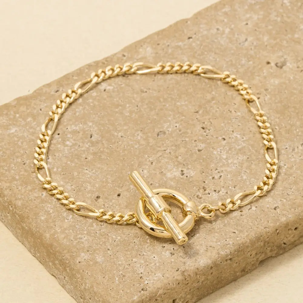 This piece is designed to be both stylish and functional, this chain bracelet contains a special figaro toggle design. Infuse elegance into your daily wardrobe with the versatile charm of this must-have chain bracelet. Available in G, S. This item is sold in packs of 1. This chain bracelet is made with 90% Brass and 10% Zinc.