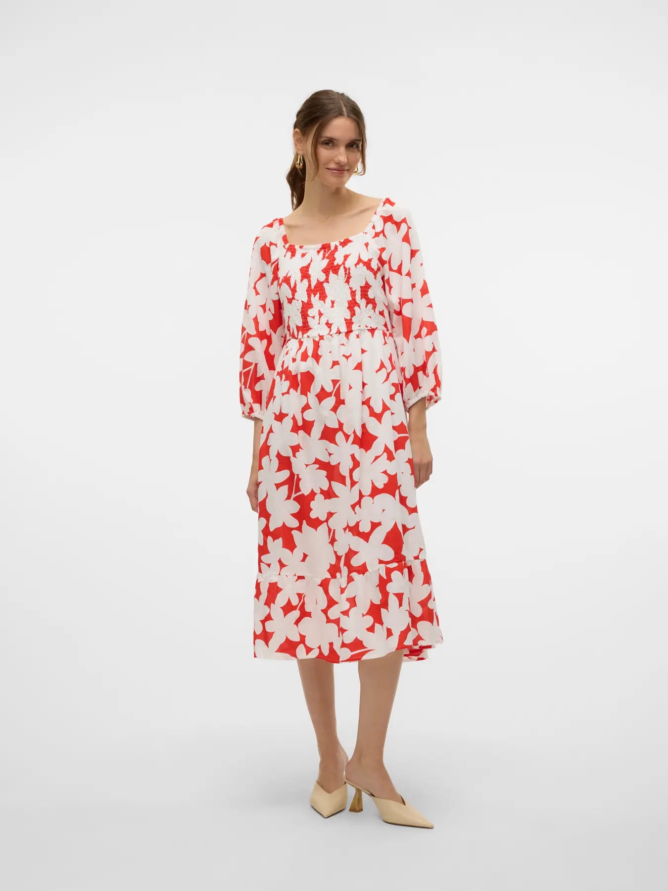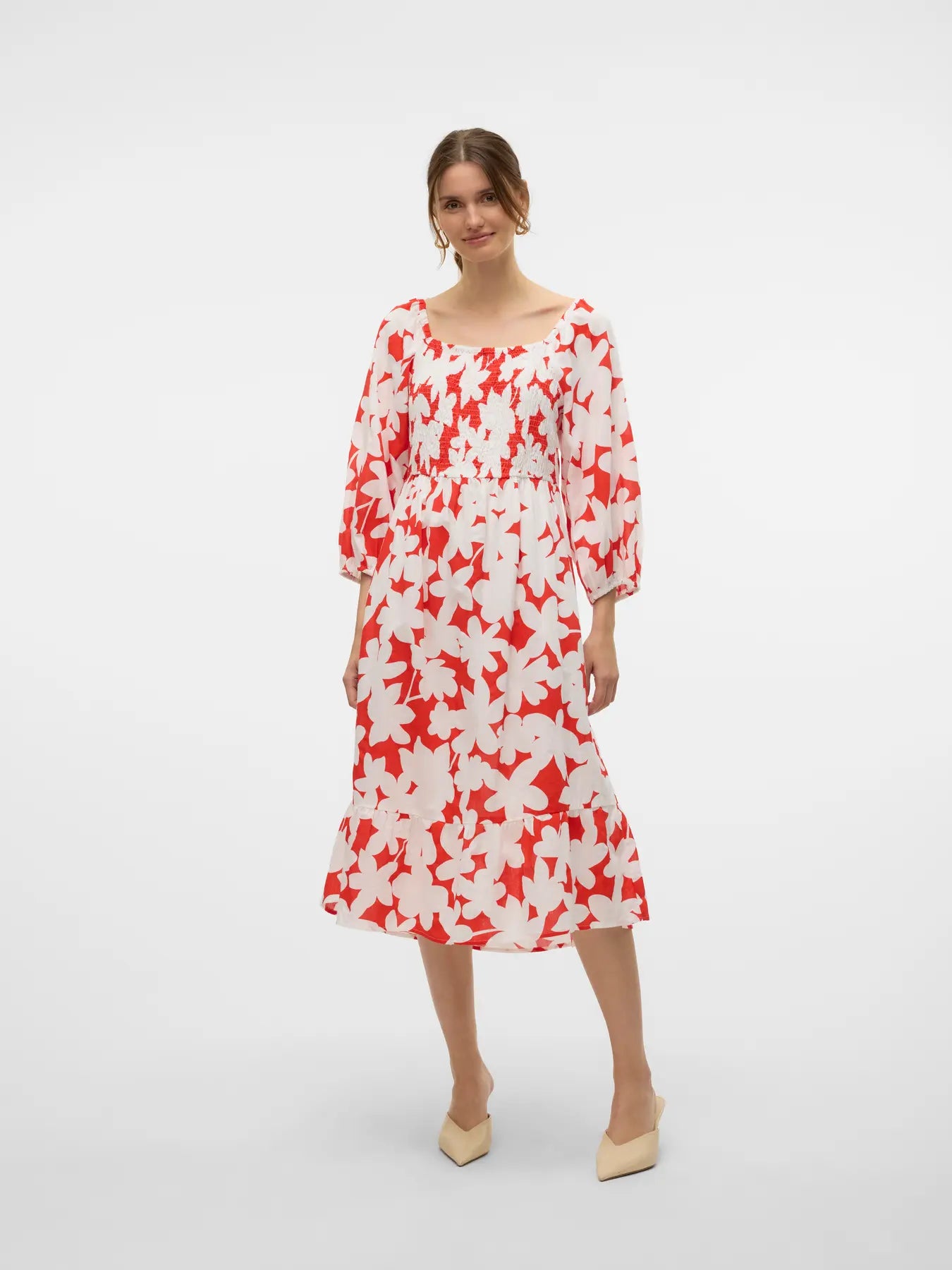 Flower-prints just add the right amount of feminine touch to your look, making the flower-printed dress a perfect addition to your summer wardrobe. If the look gets too cute, simply add a pair of cool sneakers to tone it down a bit. Remember your favourite accessories!. - Product Type : Dress - Neck : Square neck - Sleeve : 3/4 sleeves - Sleeves : Balloon sleeves - Cuffs : Elasticated cuffs - Length/Size : Calf length - Extra details : Smock detail - Print : Print repeated across the entire surface of the product - Fit : Regular Fit